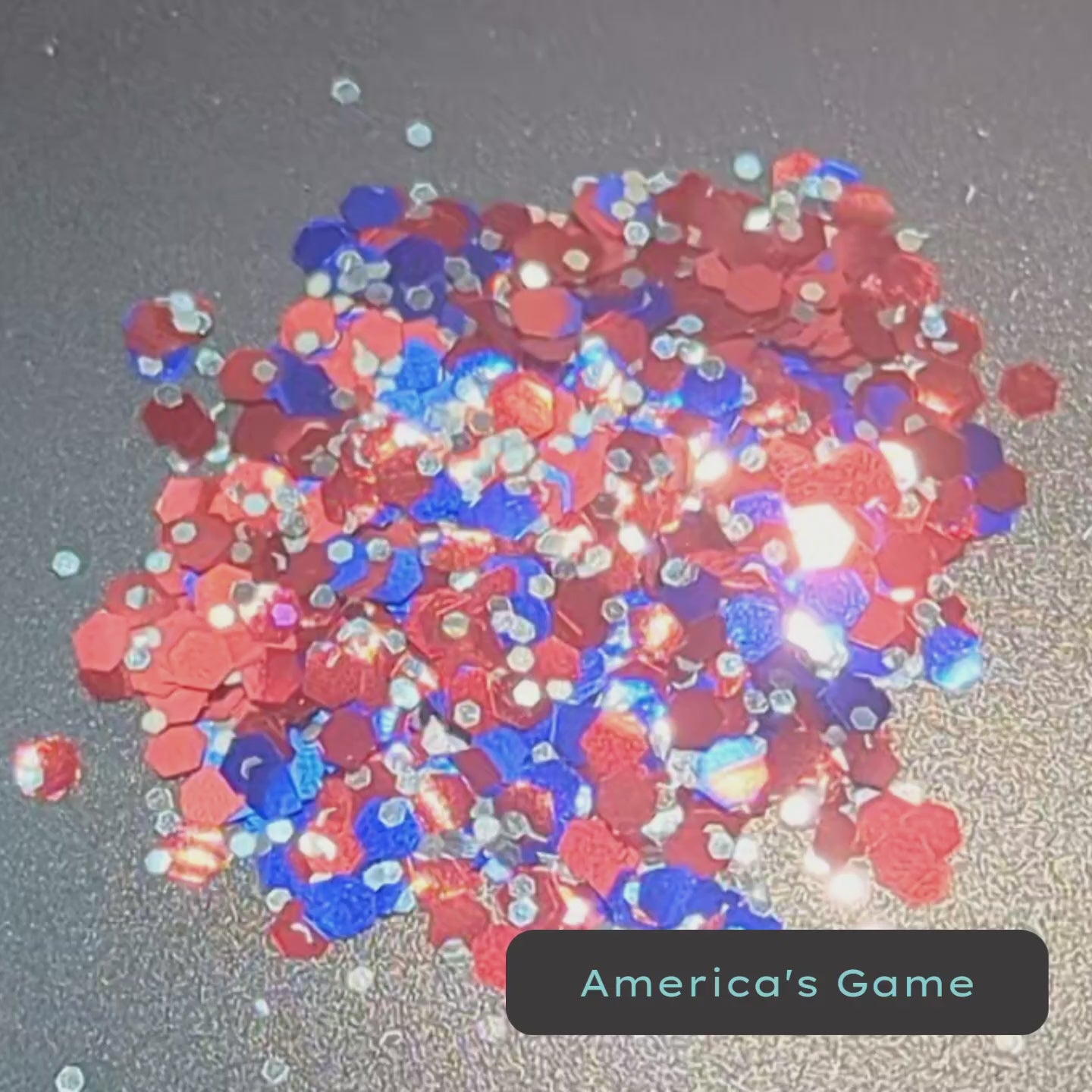 America's Game is red, silver and blue biodegradable glitter flakes in mixed sizes. This is the perfect glitter for any of your USA theme products. It is also a great option for face, body, hair or beard glitter to celebrate the 4th of July.