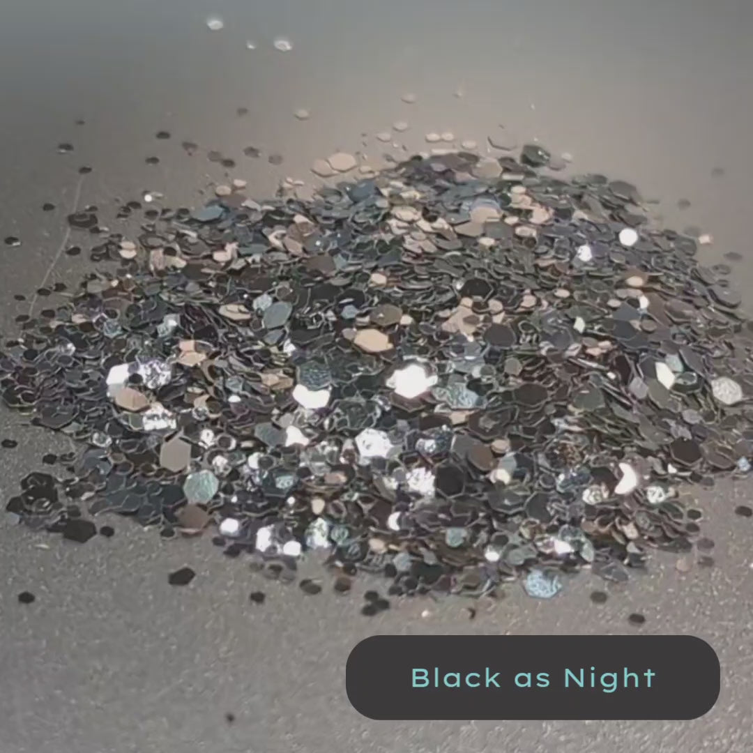 Black as Night is a solid color of black metallic biodegradable glitter flakes in mixed sizes. the black color is super saturated and a deep midnight black.Add glitter to your life, not harmful plastic to the ocean. StarSprinkles glitter has intense colors and so much sparkle. Star sprinkles Biodegradable glitter always made of plant fiber and plant cellulose, not harmful plastic.