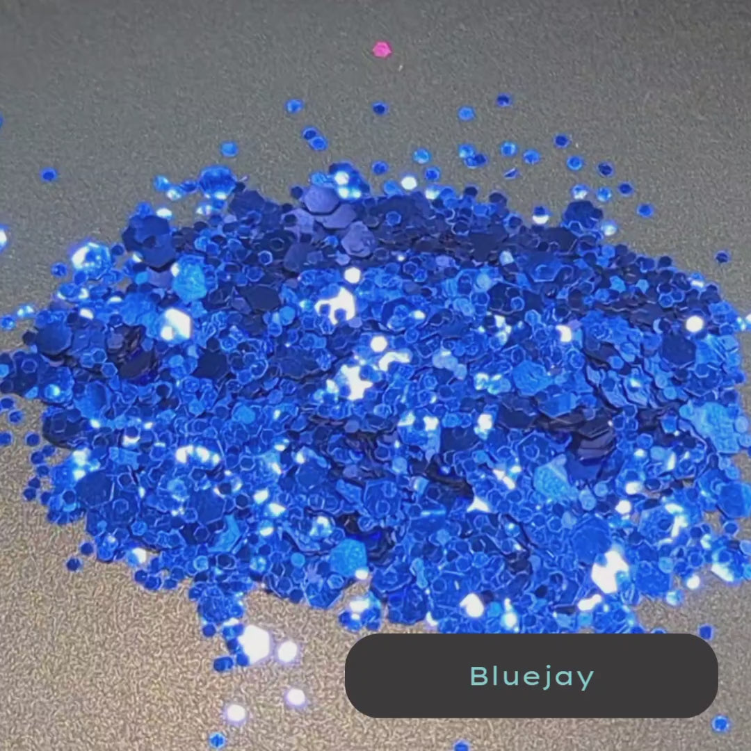 Bluejay is solid color royal Blue metallic biodegradable glitter flakes in mixed sizes.Add glitter to your life, not harmful plastic to the ocean. StarSprinkles glitter is super saturated in color and has all the shine you could ever want. are solid color blue eco glitter is perfect to spice up your blueberry scented candles or ocean and water themed soap and bathbombs.