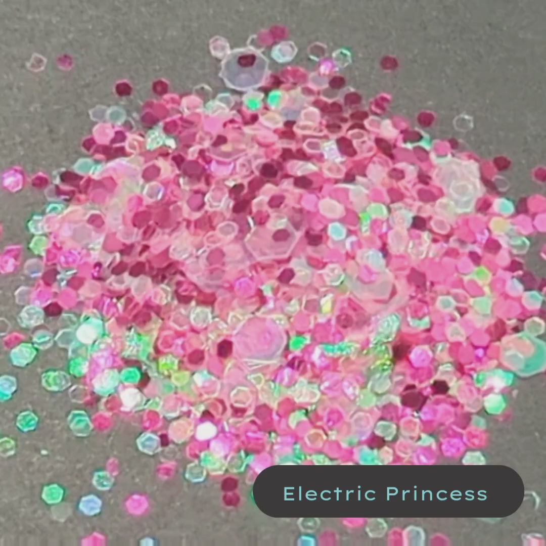 Electric Princess is small and medium size iridescent and metallic sparkles in shades of pink and fuschia. This is the perfect pairing for any soap, bath, bomb or candles that are super girly. It would be great for it's a girl baby showers or princess parties.