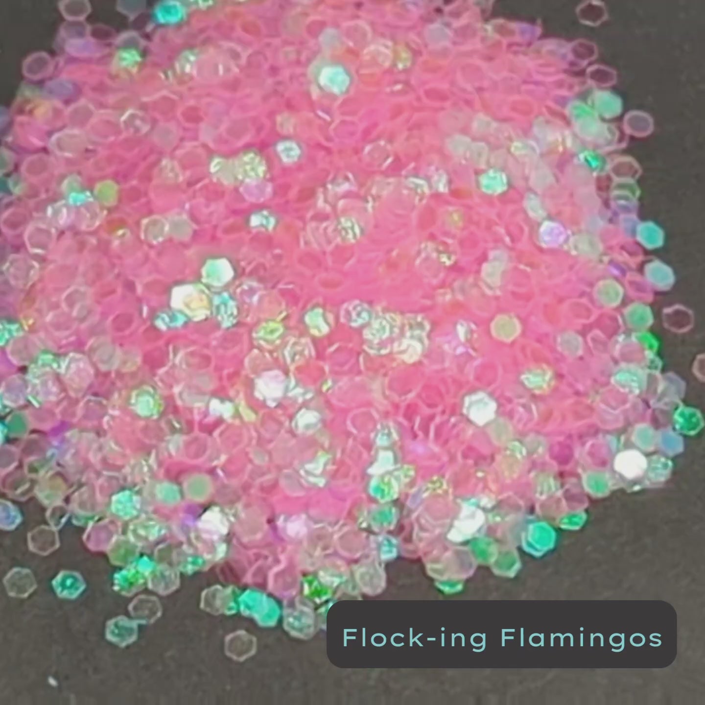 Flocking Flamingo is small neon pink iridescent sparkles. When the glitter is clusterd, the color is bright. When the Biodegradable Glitter is sprinkled, the pink color is less noticable.