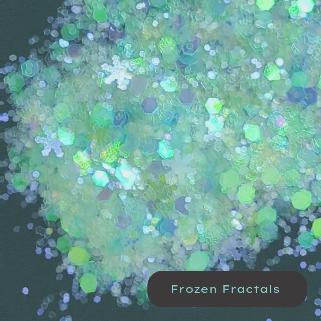 Frozen Fractals is inspired by a movie we just couldn't let go. multiple sizes of icy blue turquoise iridescent plant-based flakes combined with clear iridescent flakes and iridescent snowflakes to make this wintery sparkly mix.