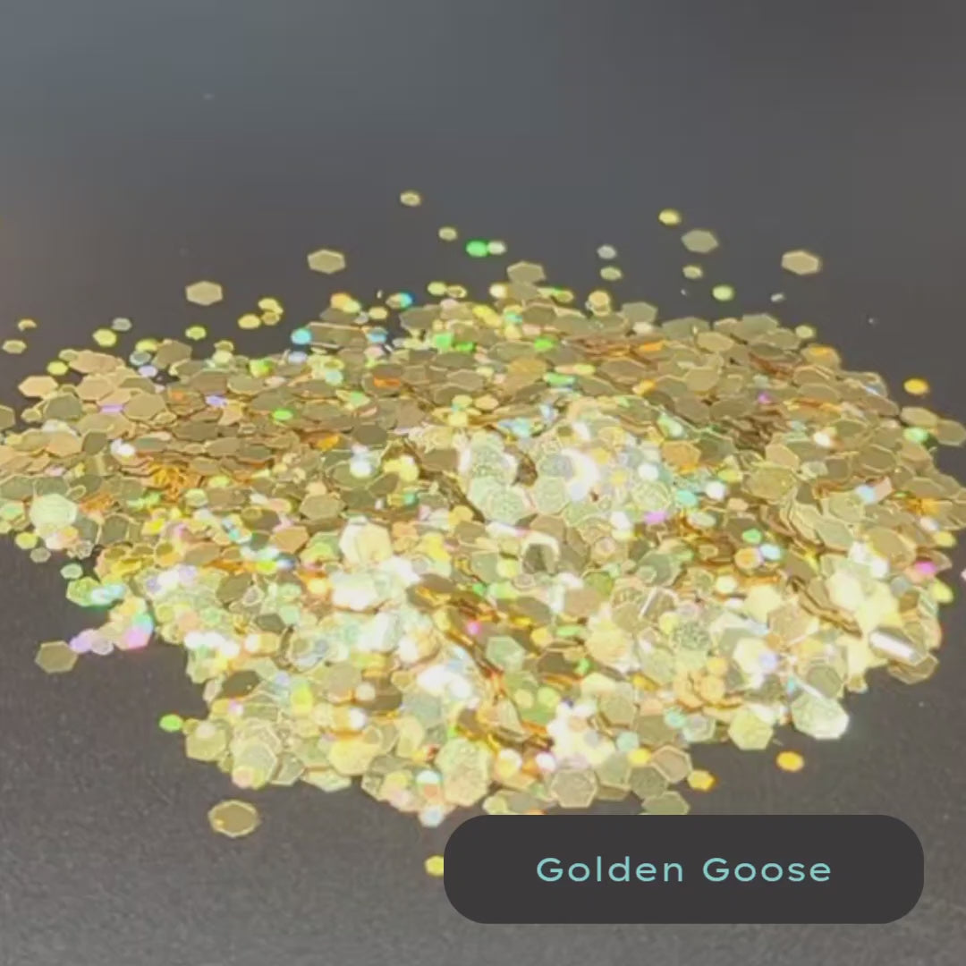 Golden Goose metallic gold biodegradable glitter flakes in mixed sizes with gold holographic compostable glitter specks.Add glitter to your life, not harmful plastic to the ocean. StarSprinkles glitter is high quality with bright colors and lots of shine and always made of plant fiber not harmful plastic.