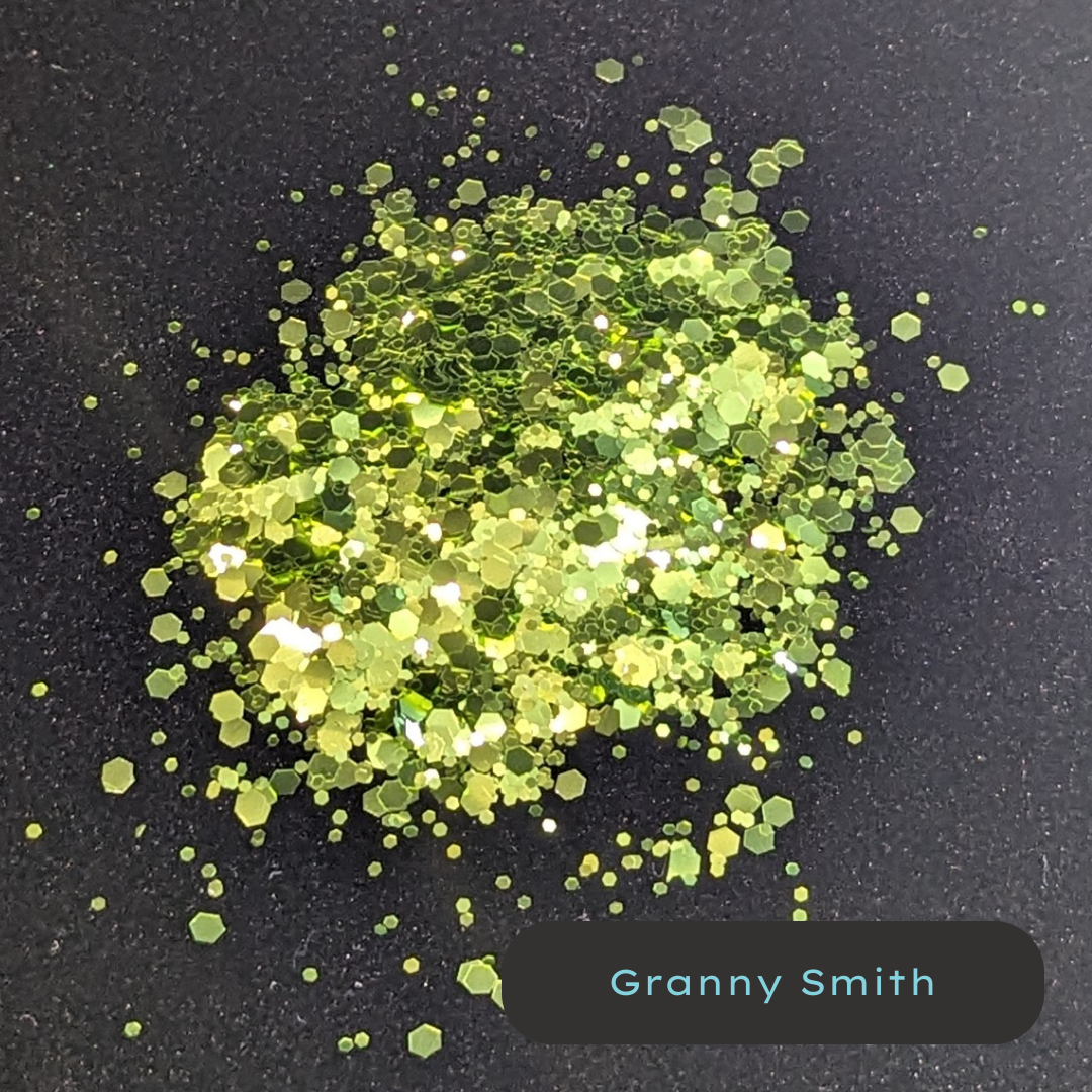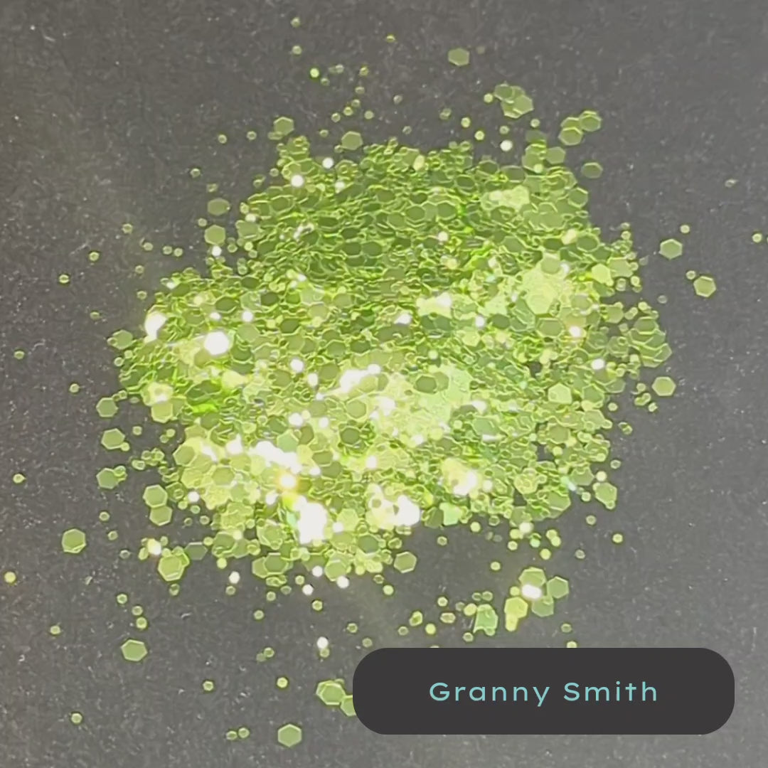 Granny Smith is juicy green Biodegradable glitter in mixed sizes of plant based glitter. Alone this would be perfect paired with scents like sour apple, white grape and lime or to accent avocado or olive. It could also be combined with another glitter for a custom biodegradable glitter blend.
