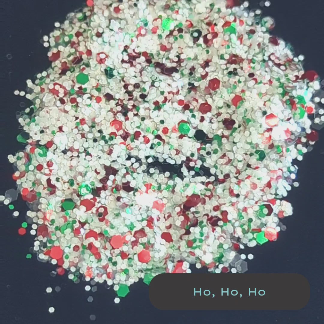 Ho Ho Ho is a classic holiday combination of red, green and white a multiple sizes of plant-based glitter flakes. This plant-based mix is beautiful on its own or when mixed with snow globe, our iridescent snowflake shaped glitter.