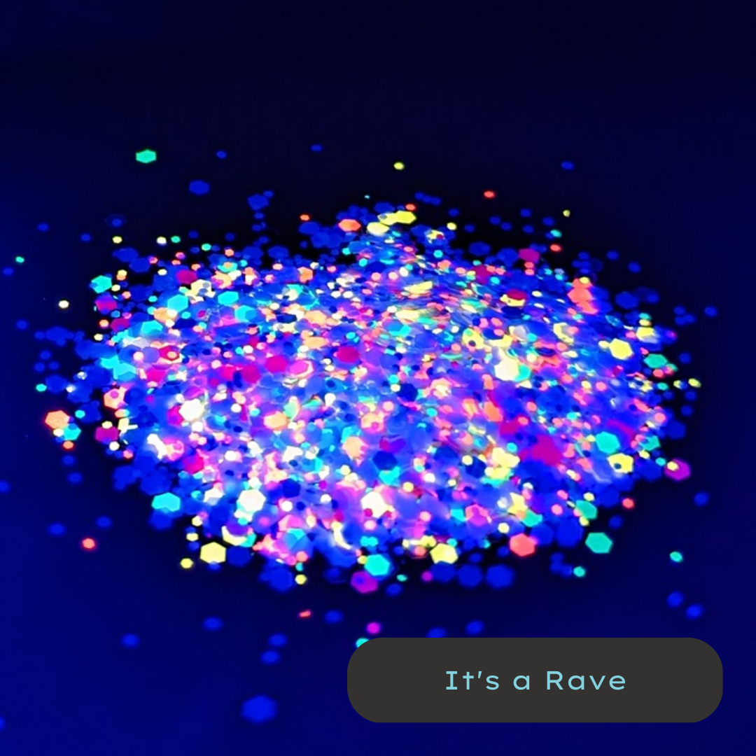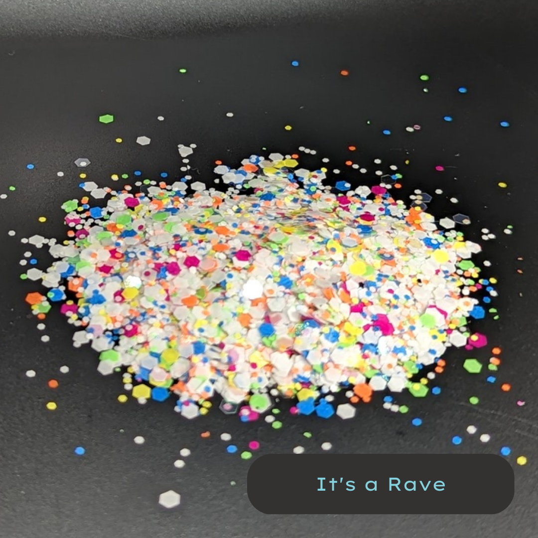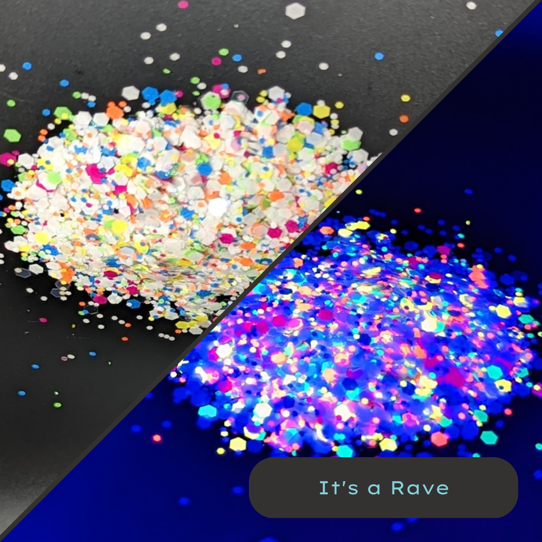 It's a Rave is part of the Neon collection. It is Neon rainbow mix of blacklight glow biodegradable glitter flakes in mixed sizes and white.Add glitter to your life, not harmful plastic to the ocean. StarSprinkles glitter is high quality with bright colors and lots of shine and always made of plant fiber not harmful plastic.
