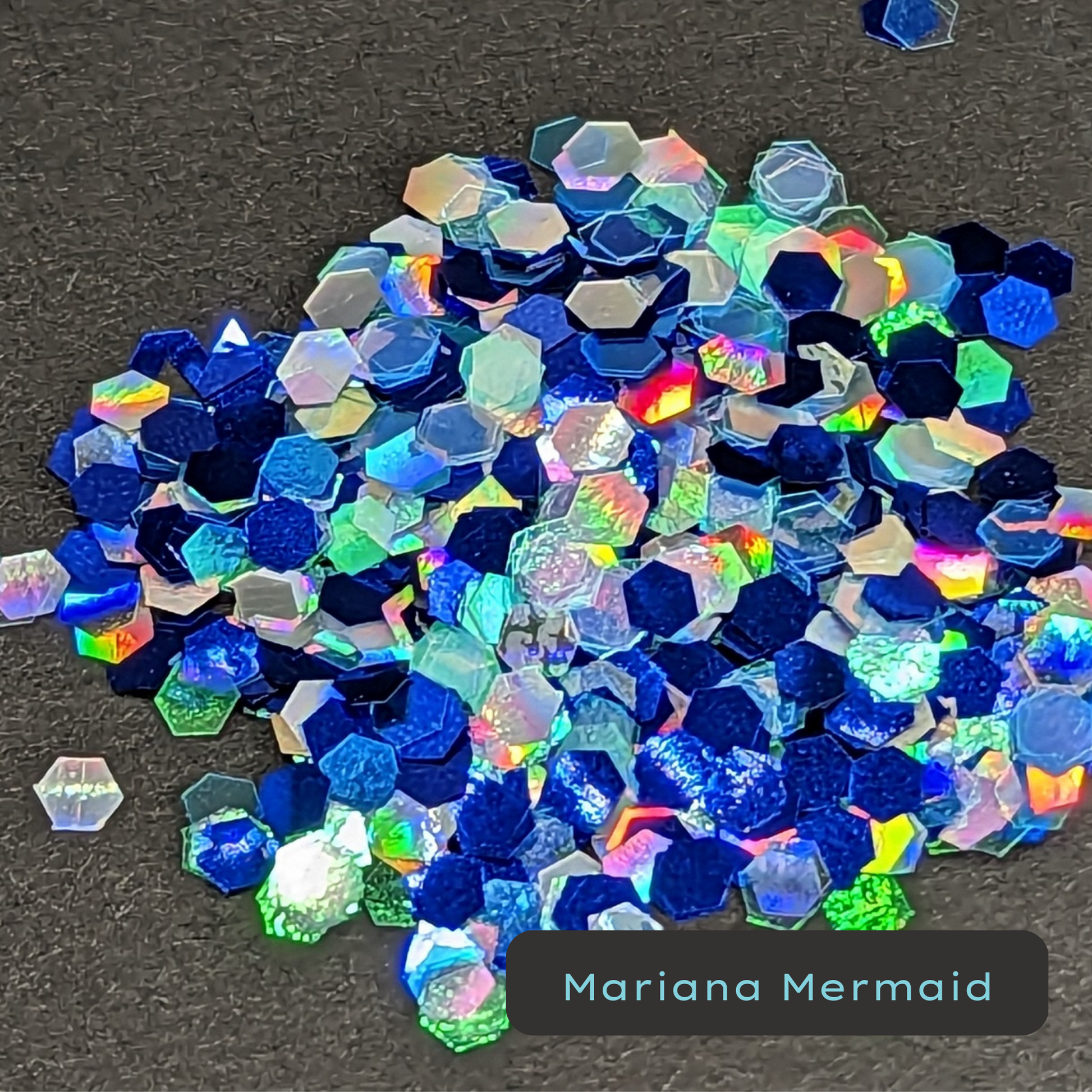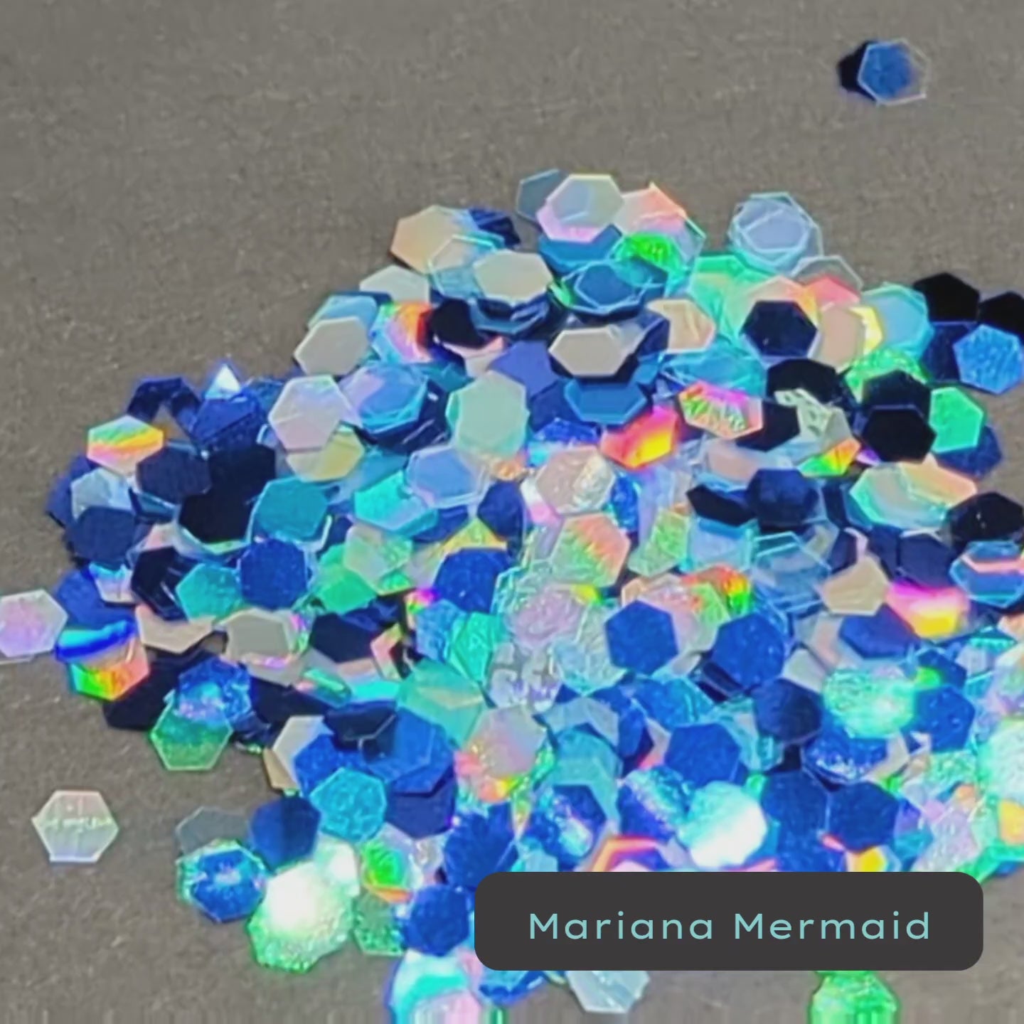 Mariana Mermaid is small and medium size blue metallic biodegradable glitter with holographic and iridescent biodegradable glitter.