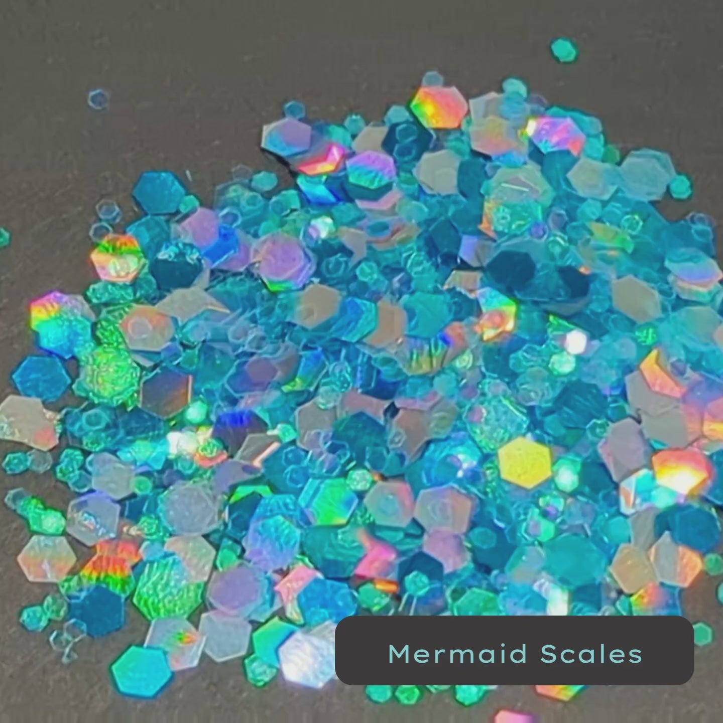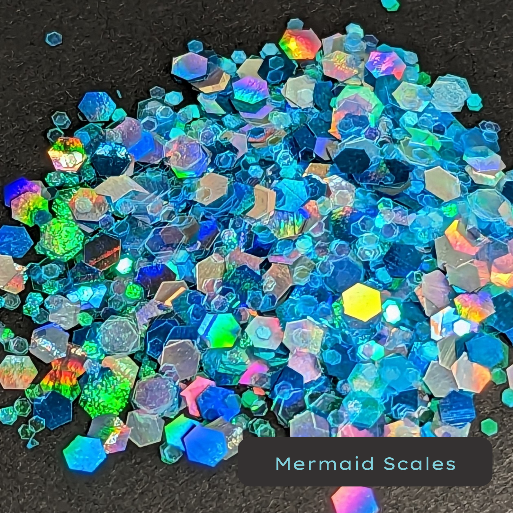 Mermaid Scales is small and medium size blue metallic biodegradable glitter with holographic and iridescent biodegradable glitter.