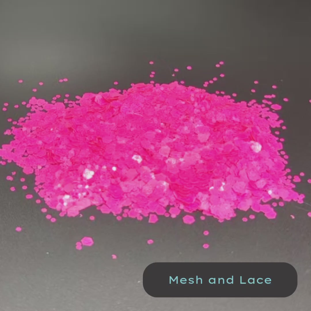 Mesh and Lace is part of the Neon collection. It is multi size mix of blacklight glow biodegradable glitter flakes in neon pink.Add glitter to your life, not harmful plastic to the ocean. StarSprinkles glitter is high quality with bright colors and lots of shine and always made of plant fiber not harmful plastic.