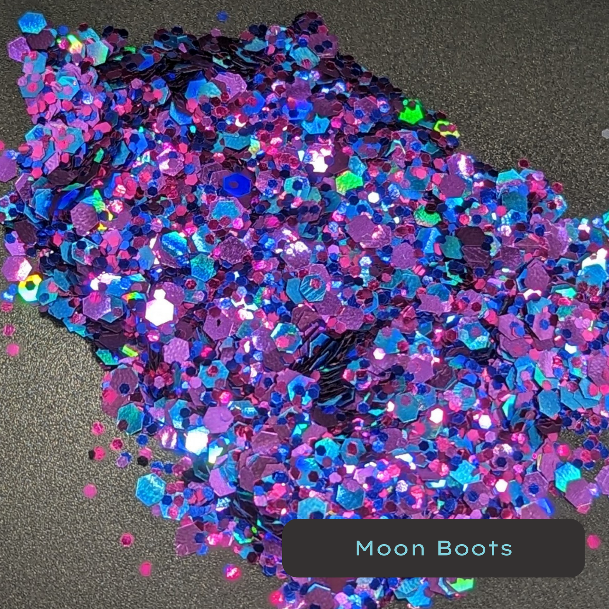 Moon Boots is part of the Galaxy collection. It has Pink, turquoise and purple biodegradable glitter flakes in mixed sizesAdd glitter to your life, not harmful plastic to the ocean. StarSprinkles glitter is high quality with bright colors and lots of shine and always made of plant fiber not harmful plastic.
