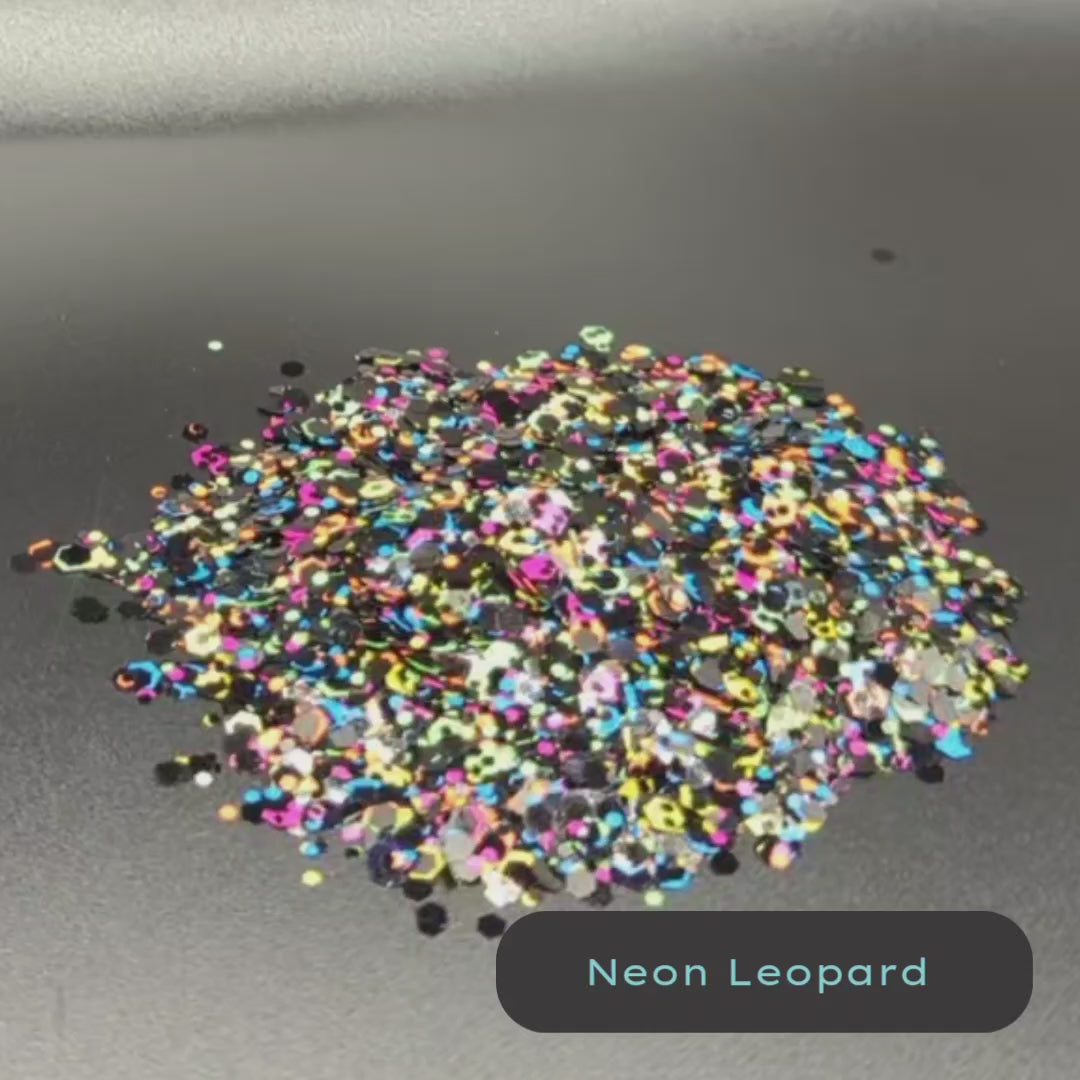 Neon Leopard is part of the Neon collection. It is Neon rainbow mix of blacklight glow biodegradable glitter flakes in mixed sizes and shiny black.Add glitter to your life, not harmful plastic to the ocean. StarSprinkles glitter is high quality with bright colors and lots of shine and always made of plant fiber not harmful plastic.