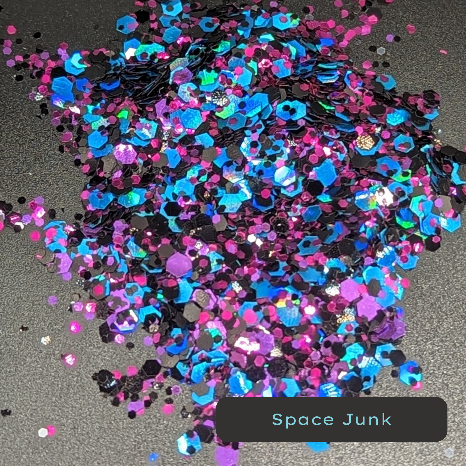 Space Junk is part of the Galaxy collection. It has Pink, turquoise Black and purple biodegradable glitter flakes in mixed sizesAdd glitter to your life, not harmful plastic to the ocean. StarSprinkles glitter is high quality with bright colors and lots of shine and always made of plant fiber not harmful plastic.