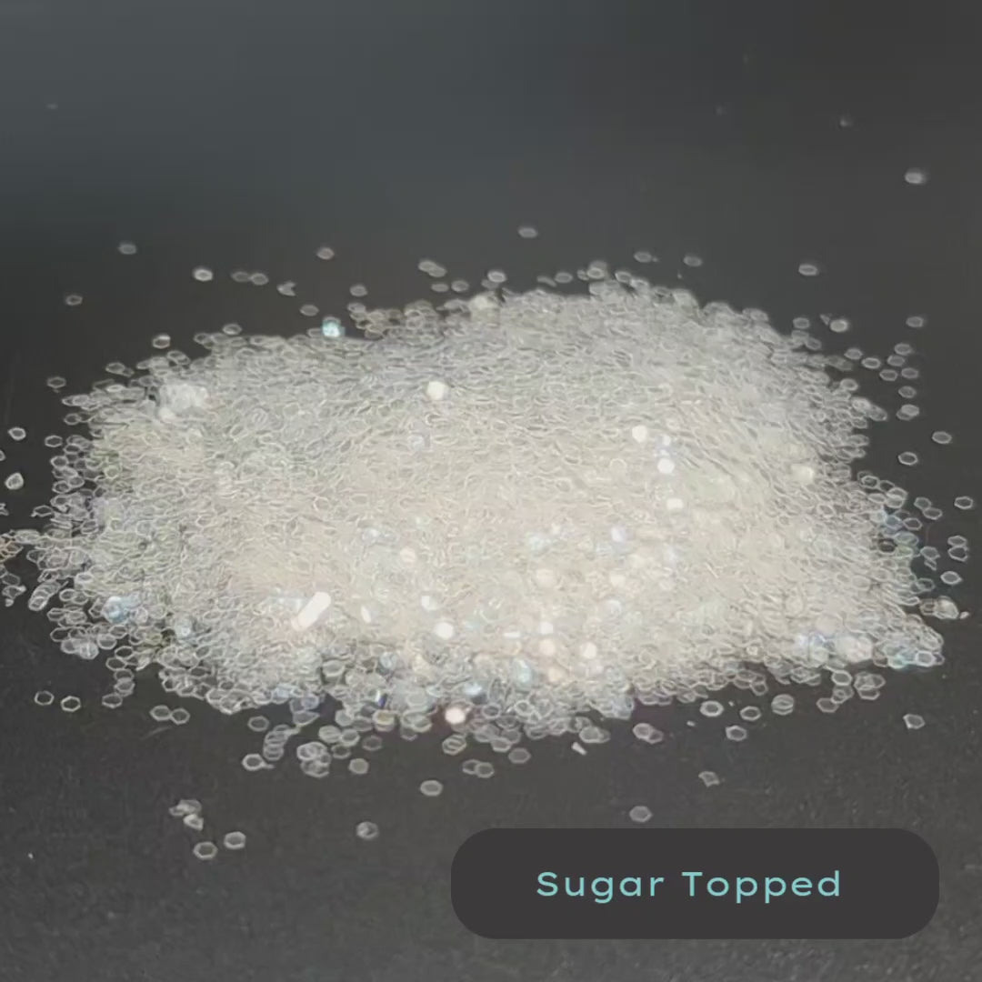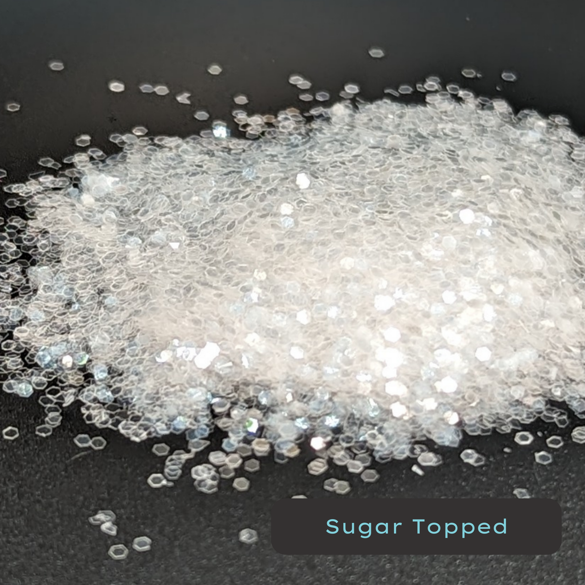 Sugar Topped is small size clear white crystal biodegradable glitter flakes.Add glitter to your life, not harmful plastic to the ocean. StarSprinkles glitter is high quality with bright colors and lots of shine and always made of plant fiber not harmful plastic.