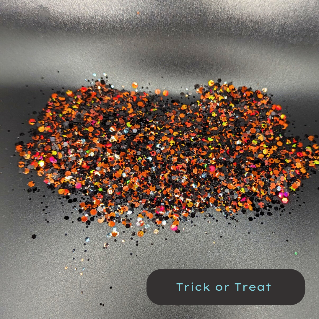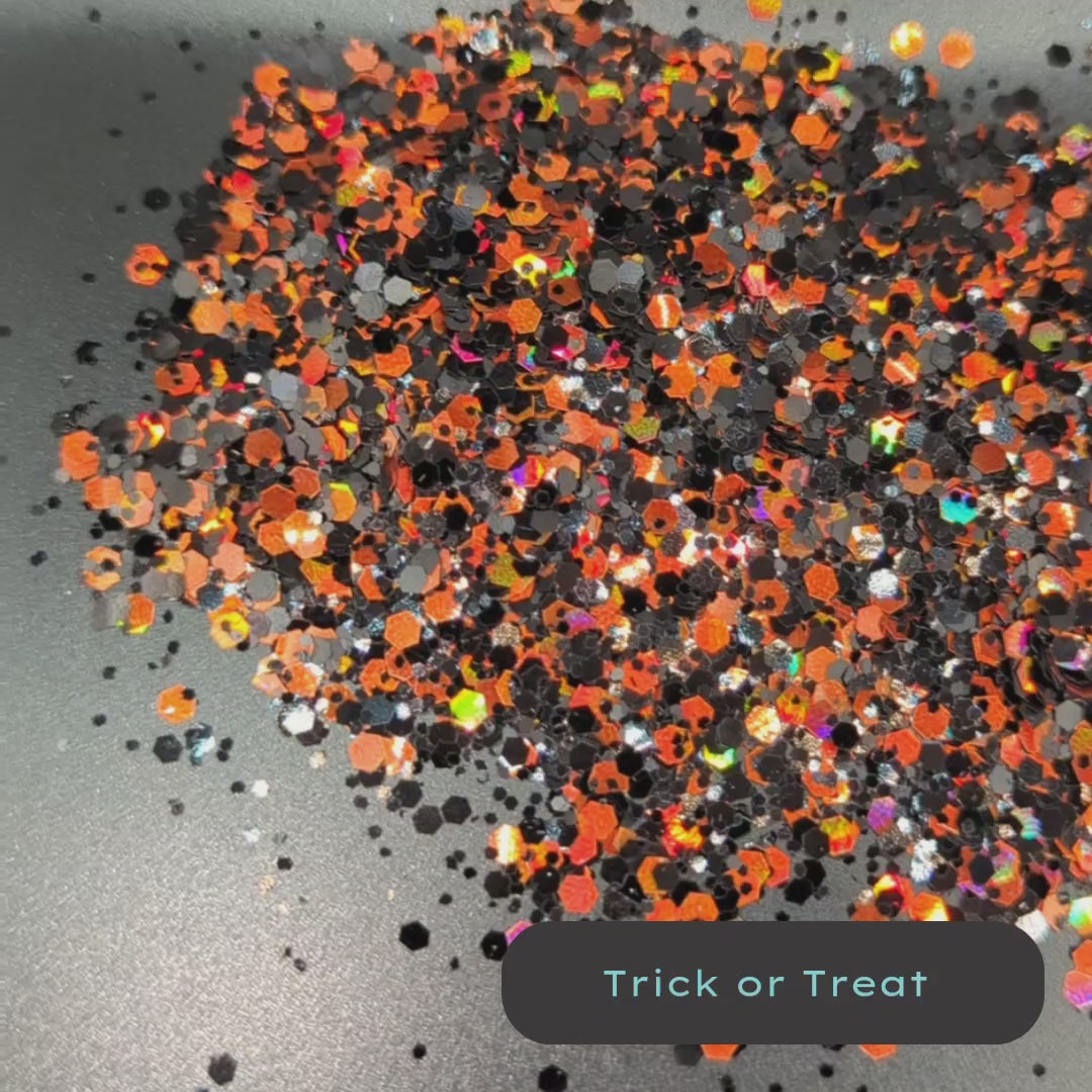 nothing says Halloween like classic black and orange. trick or treat is multiple sizes of black and orange metallic with a dark orange holographic flake added. this is the perfect accent for any Halloween product.