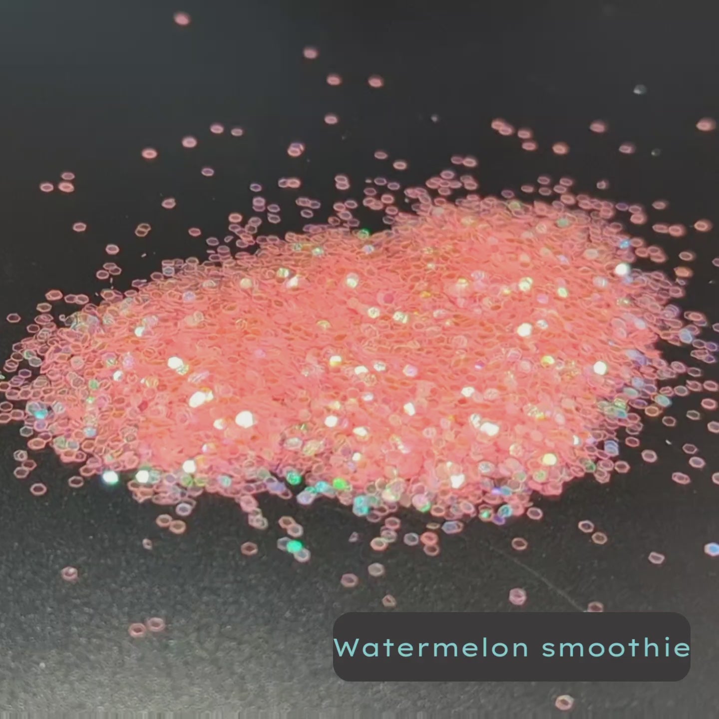 Watermelon Smoothie is small pink iridescent sparkles. When the glitter is clusterd, the color is bright. When the Biodegradable Glitter is sprinkled, the color is less noticable.